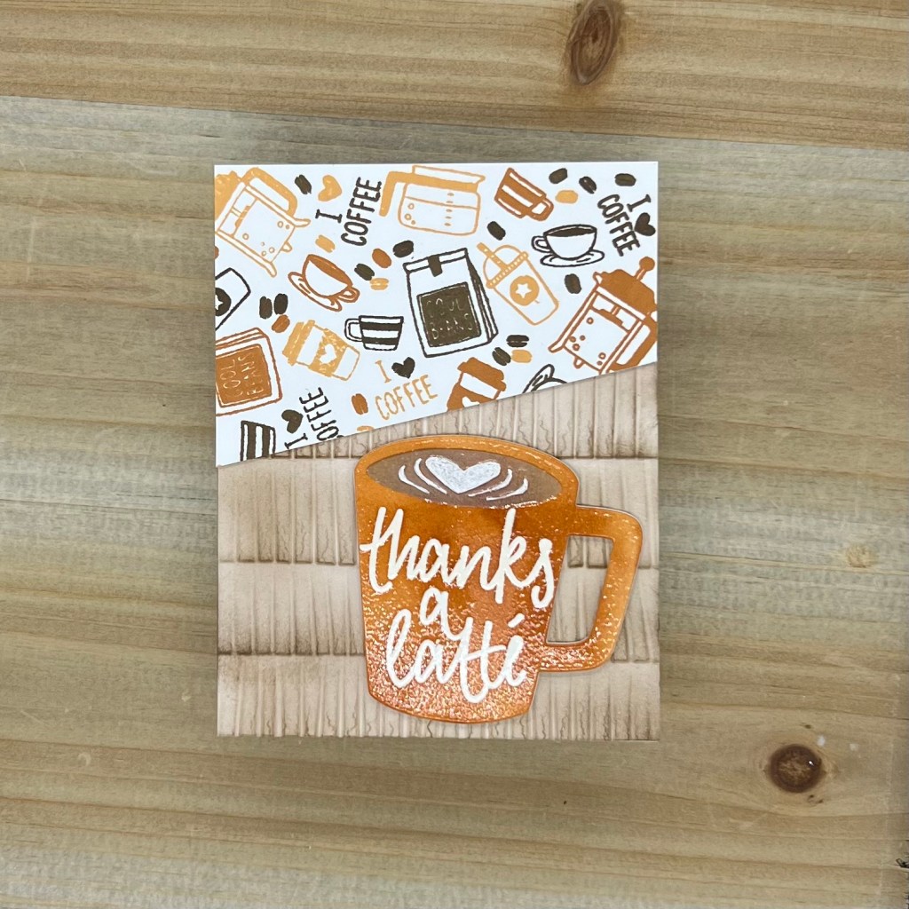 For the first card, I also created a card panel by using the Fringe 3D embossing folder from Altenew and ink blended nutmeg ink over the panel to enhance the embossing. I adhered one of the pieces of the background to the top of the card and added clear embossing ink & powder to the whole coffee cup to give it a nice shine. I stacked two more coffee cups underneath it to give it dimension and adhered it to the card panel and attached that panel to a white card base to complete my card.