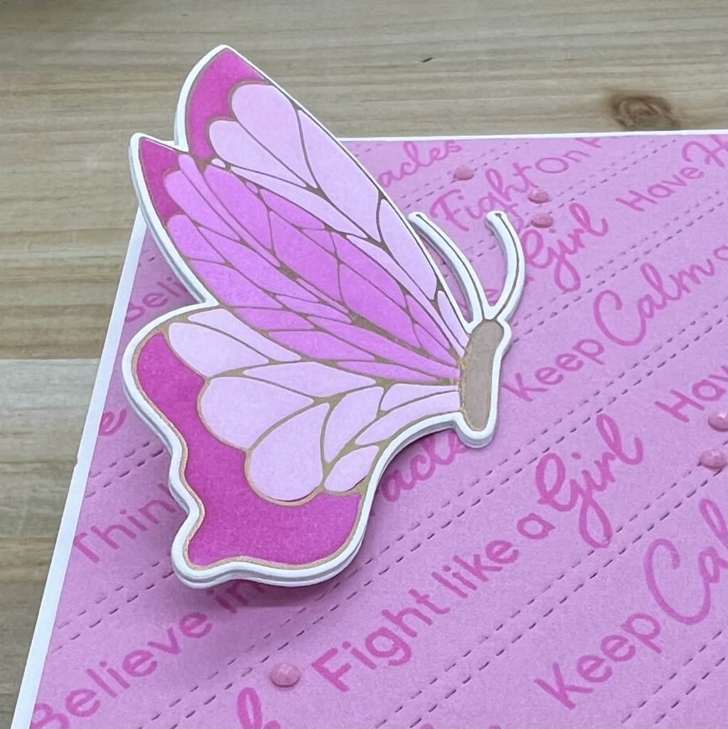 I then foiled, inked, and die cut the butterfly using the Butterflies hot foil plate, coordinating stencils, dies, and inks from PinkFreshStudio and foil from Spellbinders. I did the stenciling using my Altenew StampWheel while watching baseball since I am hoping to see the Rangers in the World Series!
