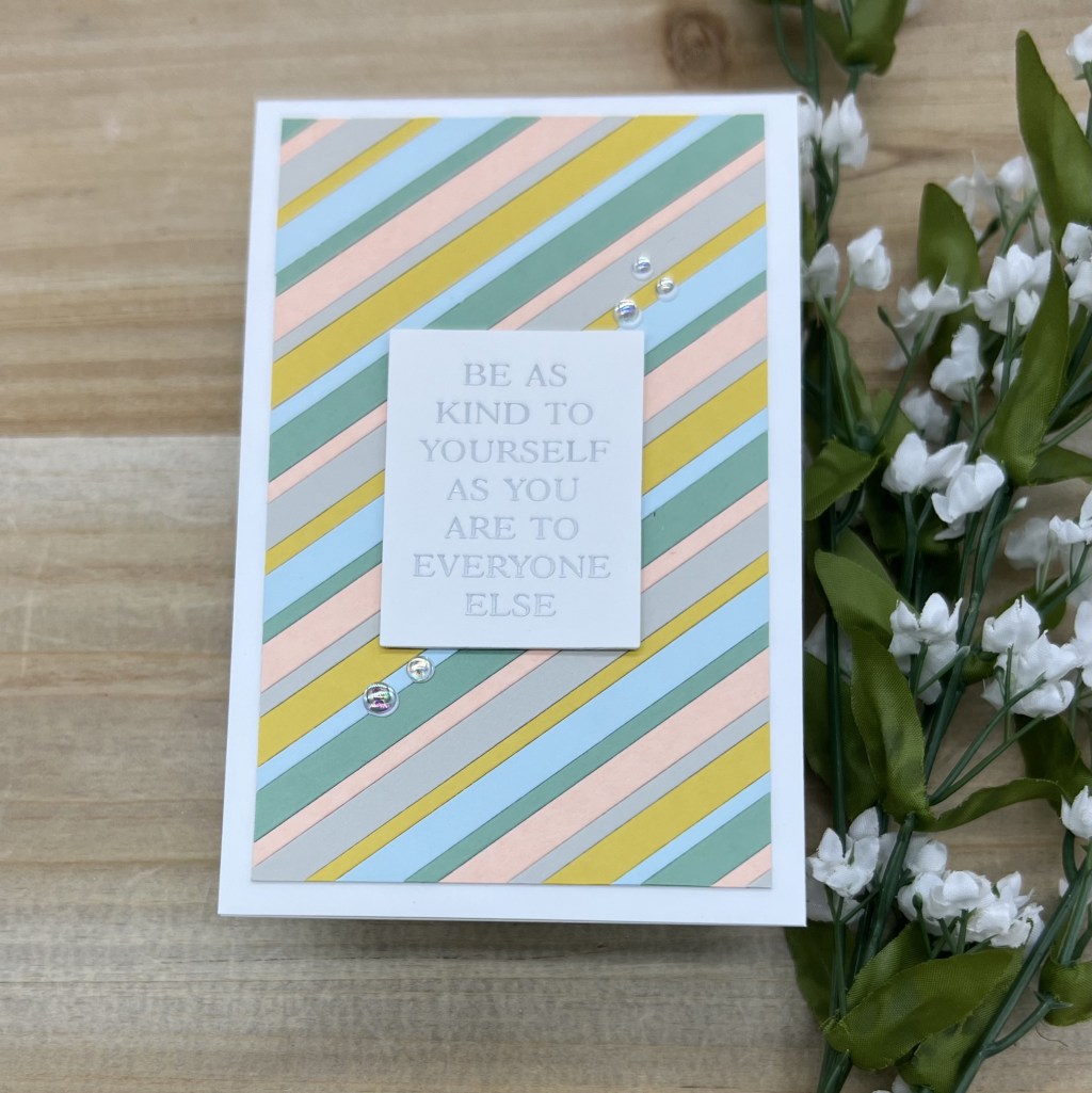 My second card used some strips of Concord and 9th cardstock that had been sitting on my desk for a few weeks, leftover from another project. I had cut the strips using The Stamp Market Quick Strips dies and adhered the strips to a piece of Altenew double sided adhesive sheets. I didn’t have enough strips to cover an entire card panel, so I adhered it to a piece of white cardstock. I then added that to a card base and trimmed it down to 3.5×5″. Using some foam tape, I adhered a PinkFresh Studio foiled sentiment to the front of the card and used more of the Trinity Stamps glass baubles to finish off the card.