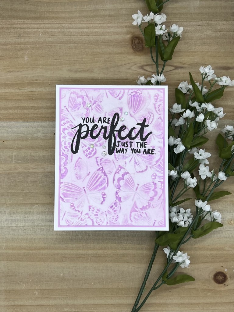 I started with a 4.25×5.5″ panel of white card stock and stamped the large sentiment in Concord and 9th black ink. Next, I used the Fantasy Butterflies Simon Says Stamp 3D Embossing Folder to emboss the panel. Then I used a Tim Holtz Brayer and PinkFresh Soft Lilac and Lavender inks to color the butterflies. However, I didn’t like how it looked on the white background, so I used a Spellbinders Large Blending Brush and the Soft Lilac ink to color the background and trimmed it down. I used another scrap piece of white cardstock that was slightly larger than the butterfly panel, colored the edges by swiping the Soft Lilac ink pad around the edges, added the butterfly panel on top using Nuvo Deluxe Adhesive, and adhered that to my white card base. I finished the card off by adding some Trinity Stamps glass baubles.